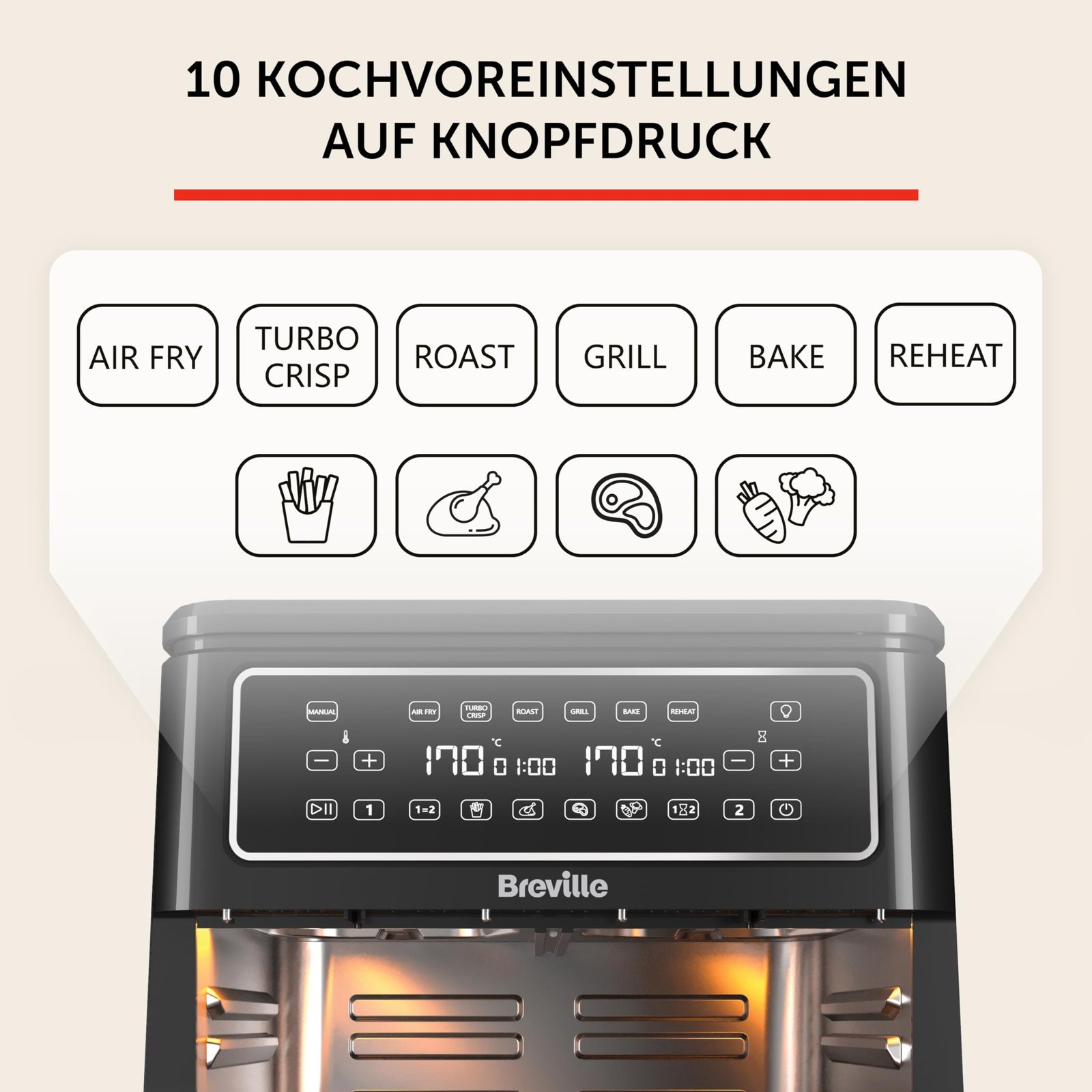 - GESUNDE, LECKERE MAHLZEITEN: Diese extra große Heißluftfritteuse verwendet eine 360°-Luftzirkulation und 99,5 % weniger Öl als herkömmliche 3-Liter-Standardfritteusen von Breville für knusprige, köstliche Ergebnisse bei jeder Anwendung