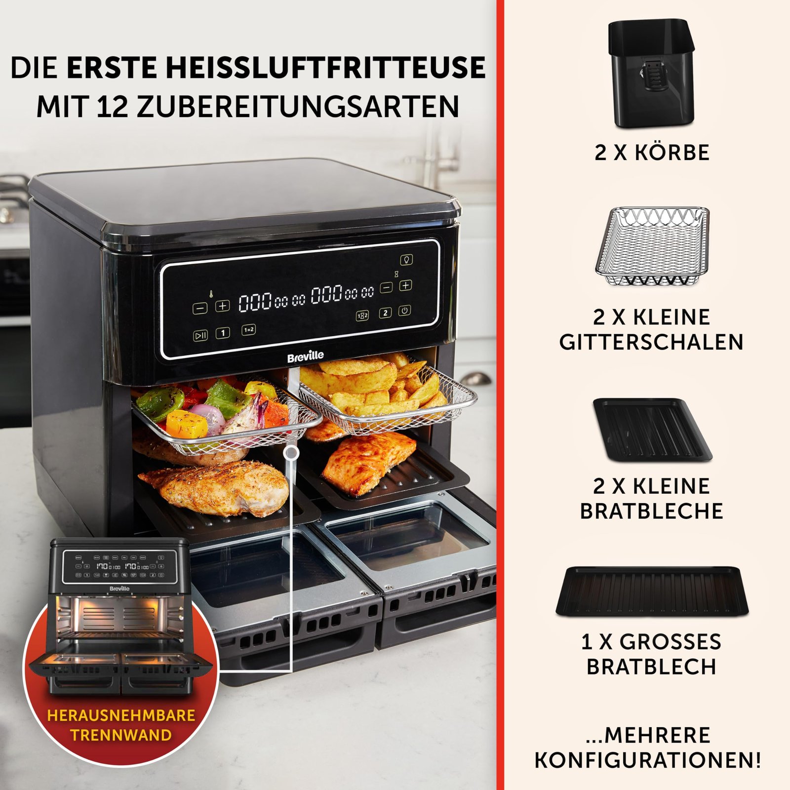 - DIE ERSTE HEISSLUFTFRITTEUSE MIT 12 ZUBEREITUNGSARTEN: XL-Garraum mit 11 Litern Fassungsvermögen, der in 2 x 5,5-Liter-Zonen aufgeteilt werden kann, mit viel Platz und einer Vielzahl von Konfigurationen für unbegrenzte Möglichkeiten für Mahlzeiten für die ganze Familie