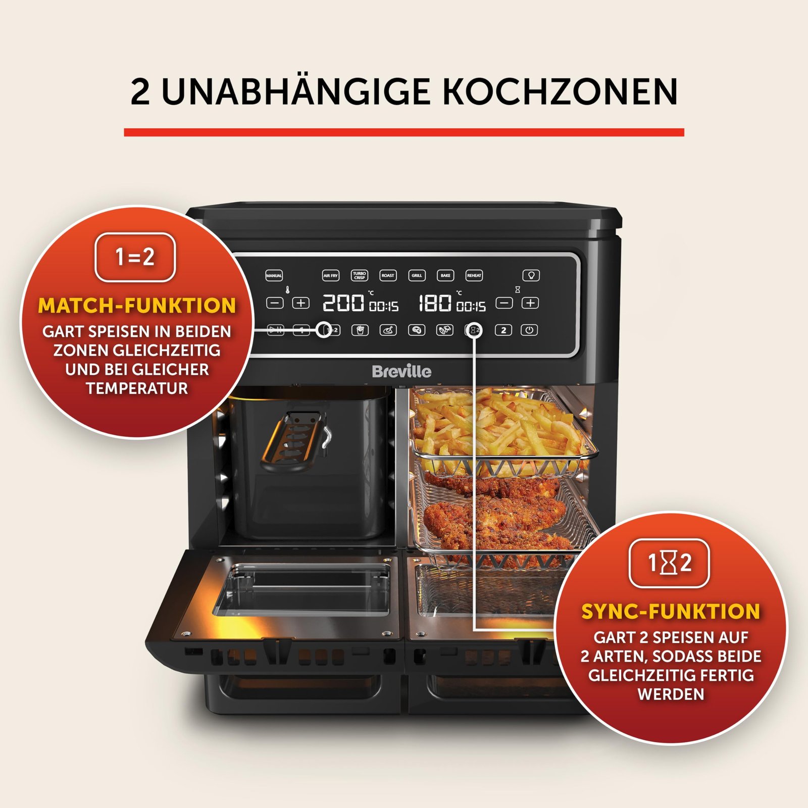 - DAS ABENDESSEN IST FERTIG, WENN SIE ES SIND: Die Sync-Funktion ermöglicht die Zubereitung von 2 Speisen auf 2 Arten, wobei beide Gerichte gleichzeitig fertig sind, während die Match-Funktion die Speisen in beiden Zonen zur gleichen Zeit und bei der gleichen Temperatur gart.