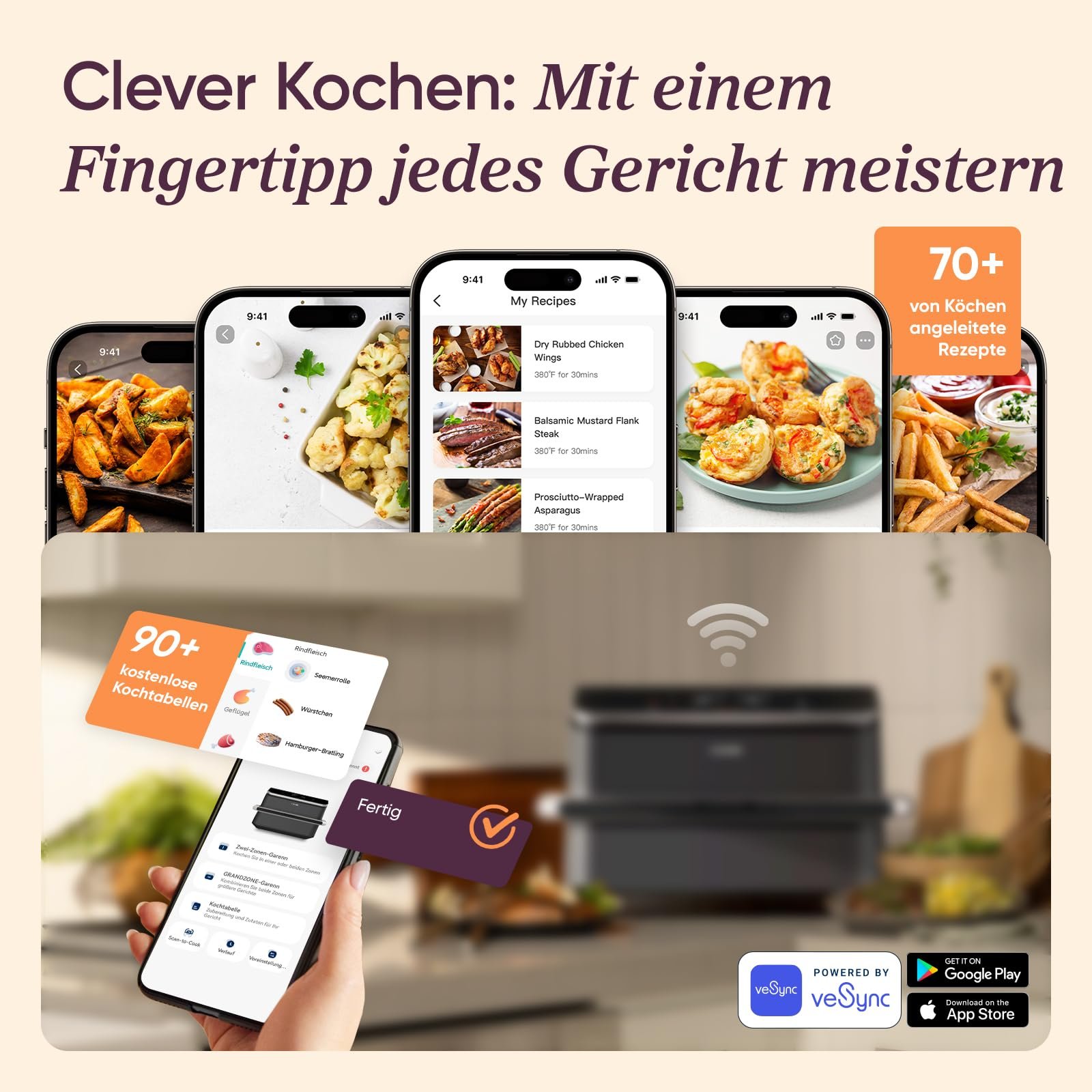 • 𝗦𝘁𝗲𝘂𝗲𝗿𝘂𝗻𝗴 𝗽𝗲𝗿 𝗔𝗽𝗽: Nach der WLAN-Verbindung lässt sich die Fritteuse per VeSync-App fernsteuern und der Kochfortschritt verfolgen