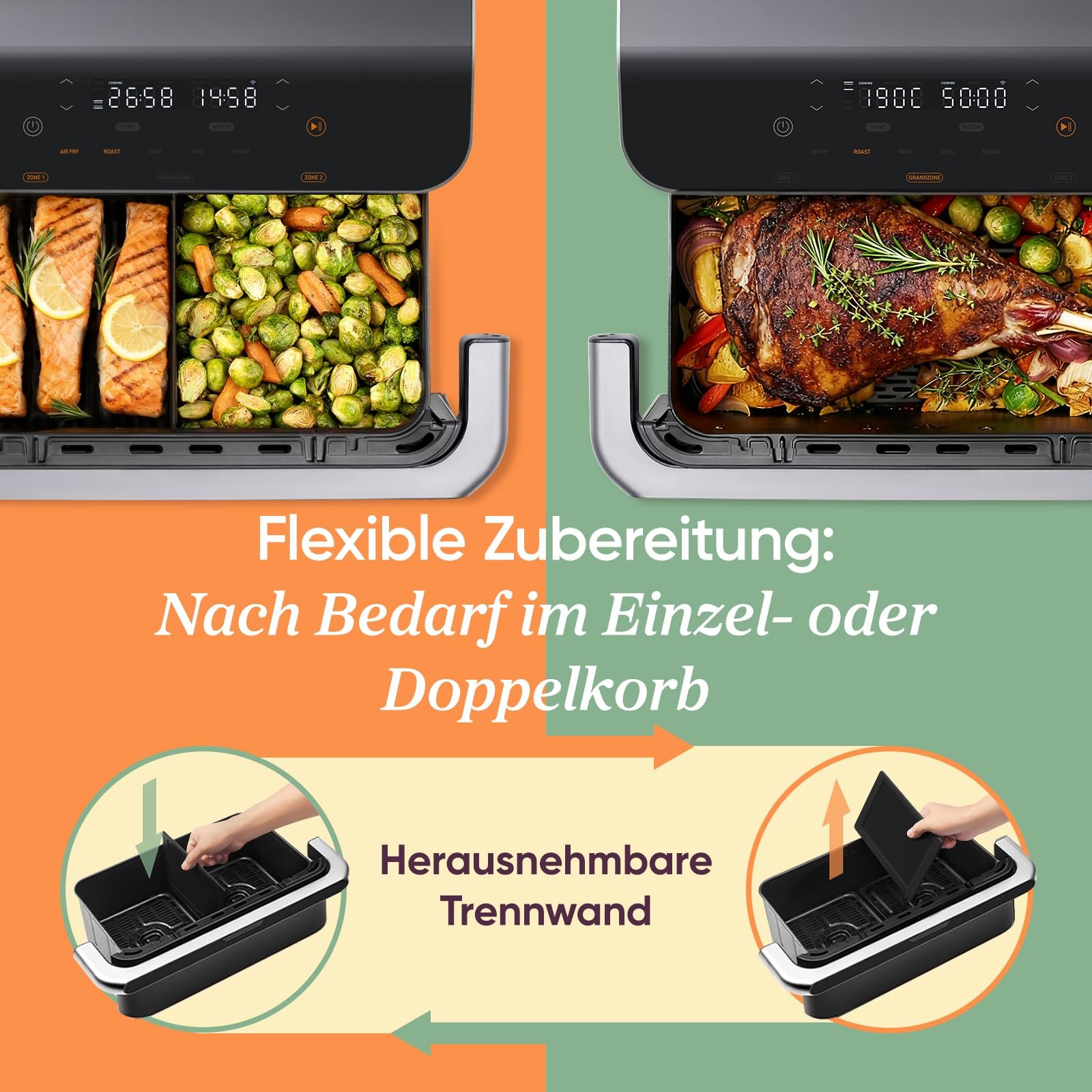 • 𝗞𝗼𝗰𝗵𝗲𝗻 𝗼𝗵𝗻𝗲 𝗚𝗿𝗲𝗻𝘇𝗲𝗻: Bis zu 10 L Garraum mit Flexible-Kammern – auch für Lammkeule und Schweinekoteletts, die in 2-Kammern-Airfryern nicht passen