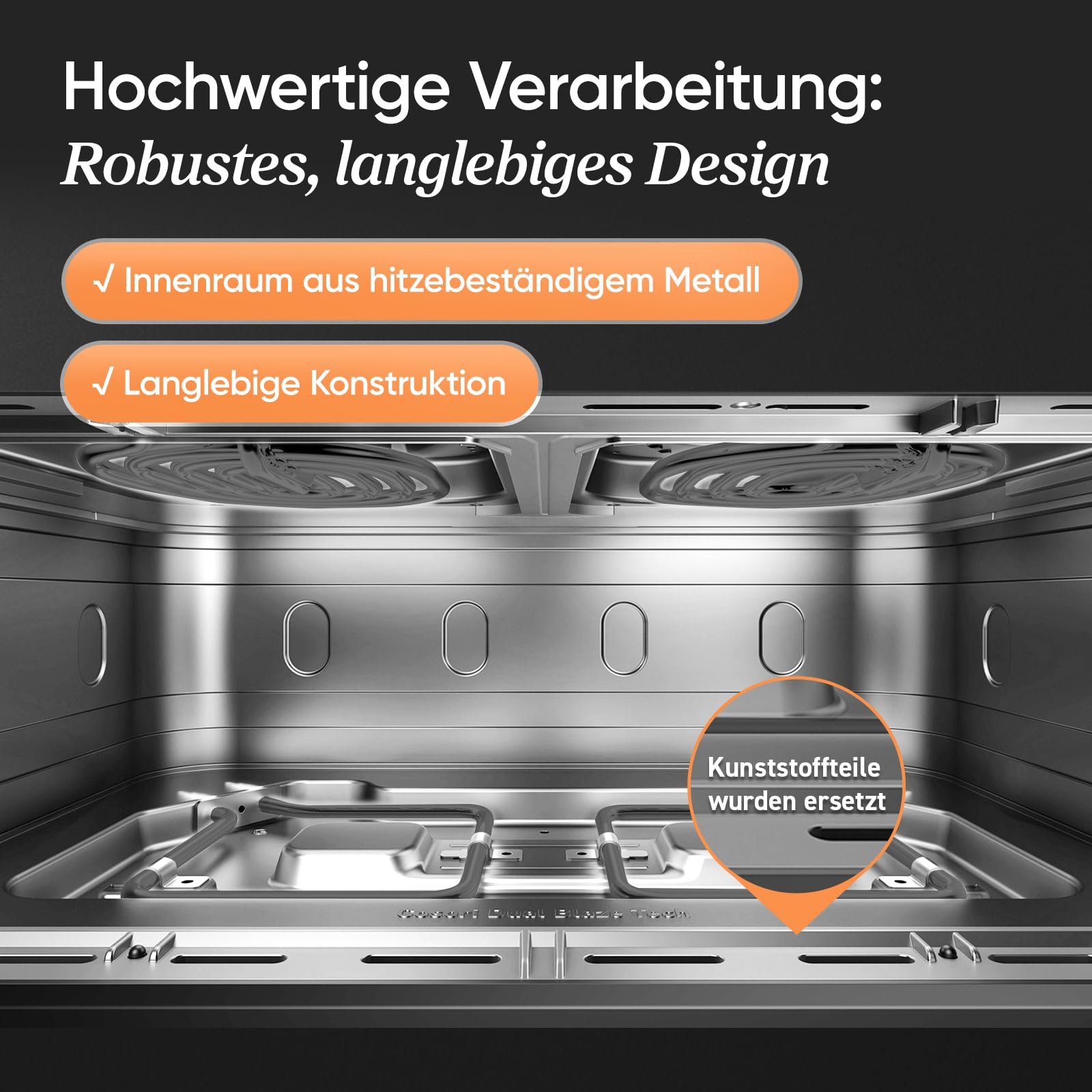 • 𝗠𝗲𝘁𝗮𝗹𝗹-𝗚𝗮𝗿𝗿𝗮𝘂𝗺: Der Garraum besteht aus Metall statt herkömmlichem Kunststoff – für mehr Haltbarkeit und Sicherheit