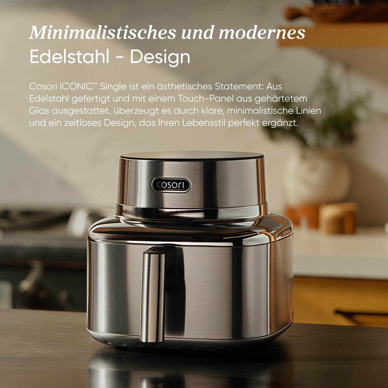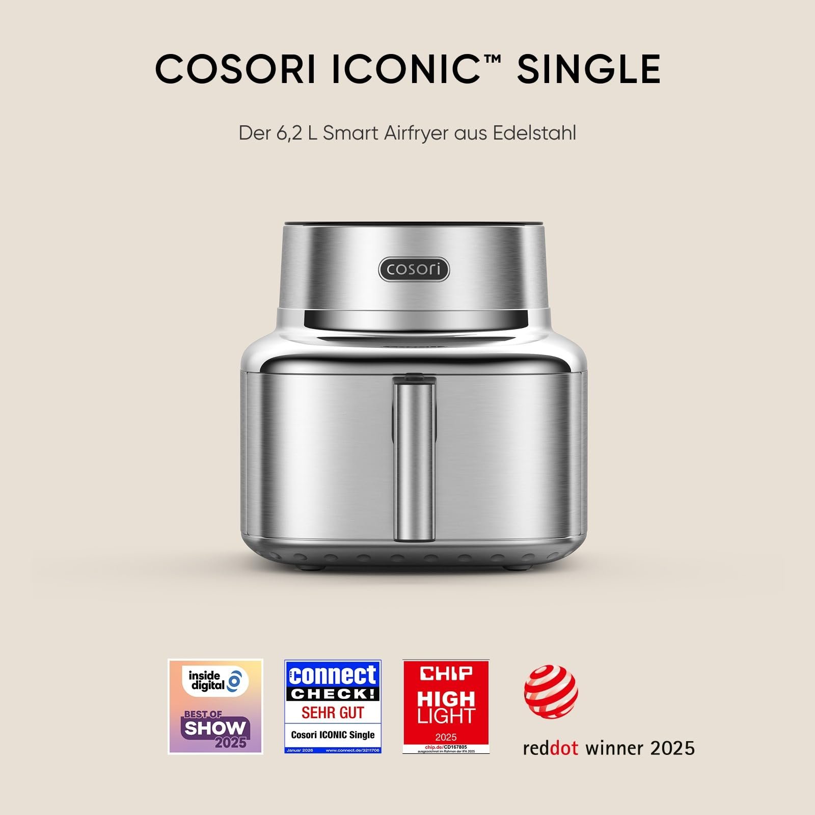 Produkteinführung: ICONIC Single ist der neue Premium-Airfryer von COSORI – gefertigt aus hochwertigem Edelstahl. Sein edles, minimalistisches Design vereint einen PFAS-freien Garinnenraum sowie einen PFAS-freien Garkorb mit Keramikbeschichtung mit einem hocheffizienten DC-Motor, der für gleichmäßige Hitze und zuverlässige Ergebnisse sorgt.In Kombination mit der VeSync-App wird Kochen smarter und müheloser: Eine sorgfältig zusammengestellte Rezeptsammlung mit praxisnahen Tipps unterstützt die Essensplanung und bringt Leichtigkeit und Freude in die Küche.