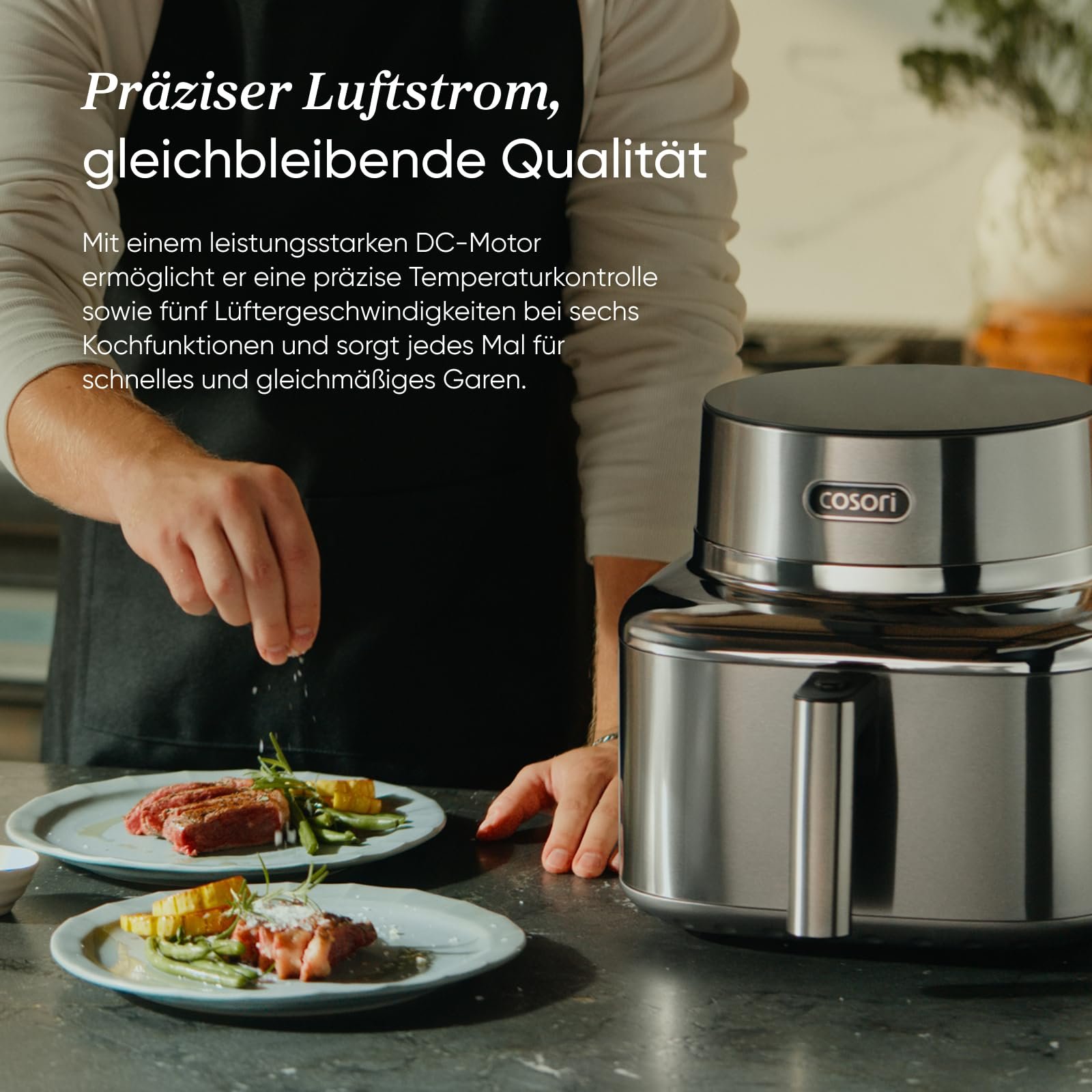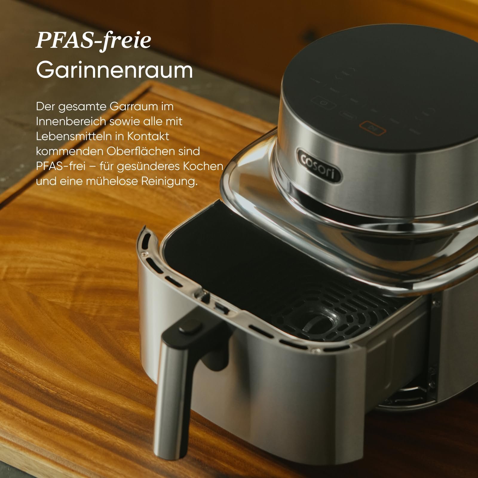 COSORI ICONIC Airfryer, 96% Edelstahl, PFAS- und BPA-freie Keramikbeschichtung, 7-in-1 Heißluftfritteuse, Backen, Grillen, Gären, Dehydrieren, 61% energiesparend, 50+ Rezepte, spülmaschinenfest, 6,2L