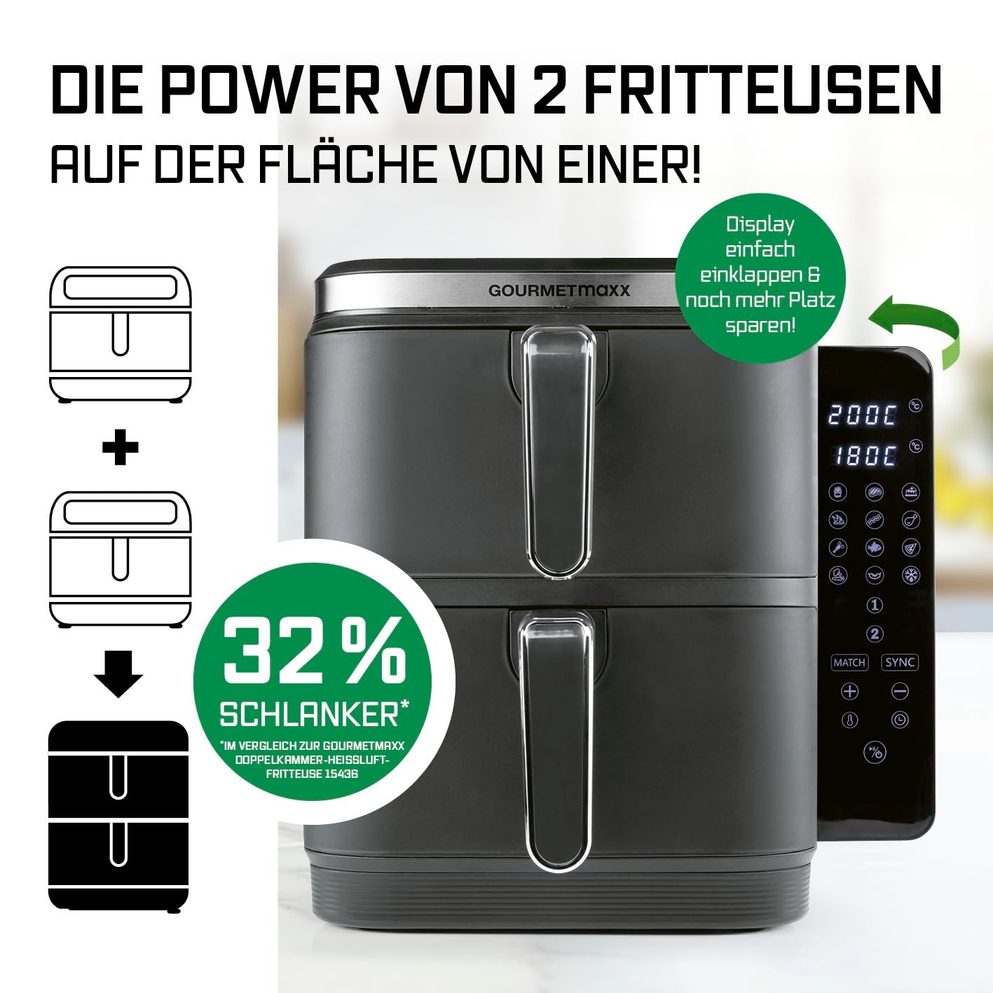 - PLATZWUNDER: Die GOURMETmaxx FryUp Vertikale Doppelkammer Heißluftfritteuse verleiht dir aufgrund ihres schlanken Designs die überlegene Power von 2 einzelnen Fritteusen auf der Fläche eines einzigen Geräts. Außerdem sparst du dank 90° flexibel einklappbarem Touchdisplay noch mehr wertvollen Platz!