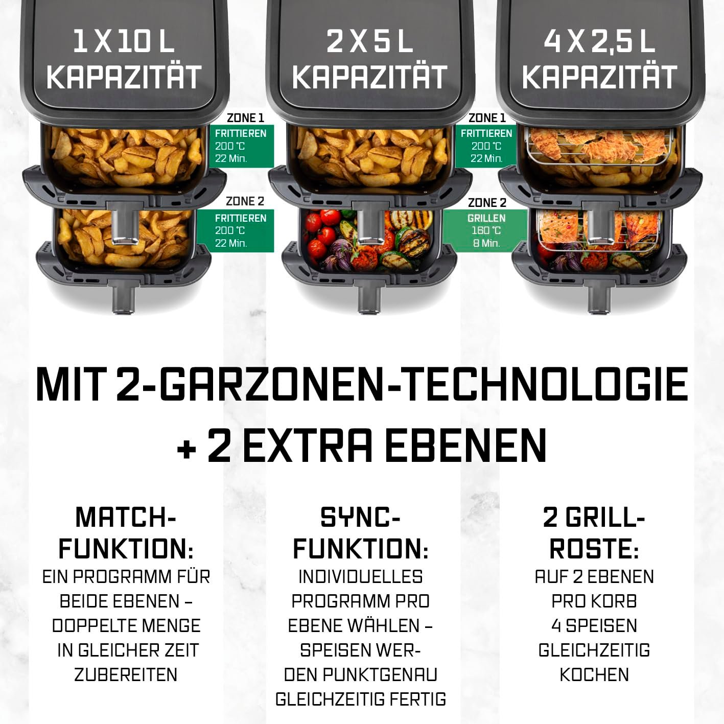 - SYNC & MATCH-FUNKTION: Hol dir die vertikale Doppelkammer-Technologie mit 2 unabhängigen Garzonen & Timerfunktion. Serviere 2 Speisen auf einmal oder bereite die doppelte Menge in der gleichen Zeit zu. Dank Heißluft-Zirkulation, gleichmäßiger Wärmeverteilung & 360°-Luftstrom immer perfekte Speisen!