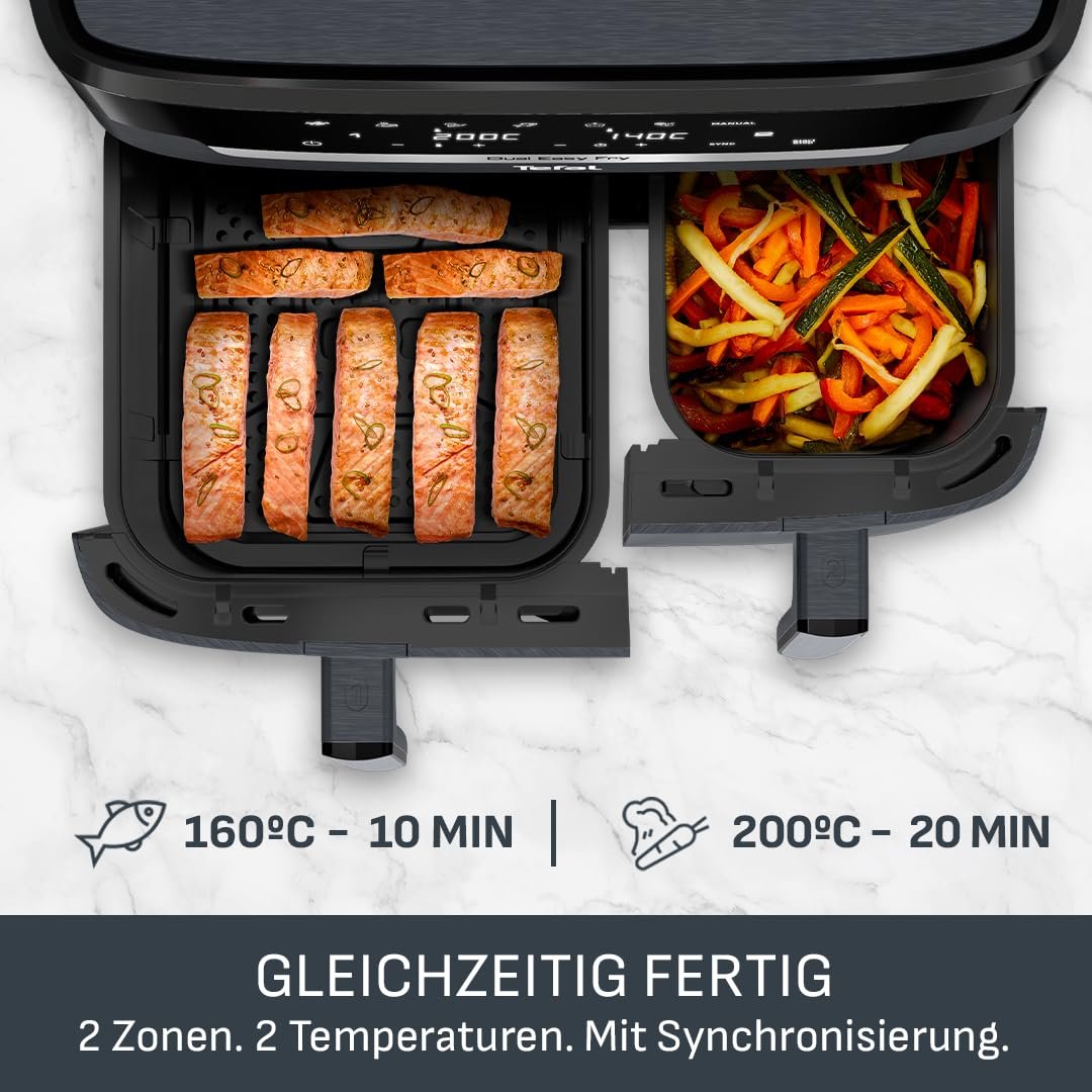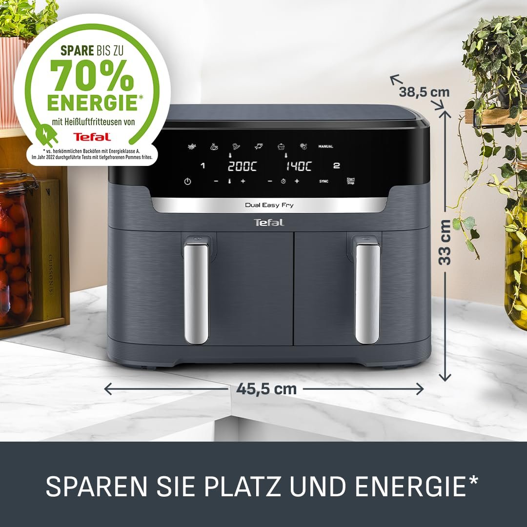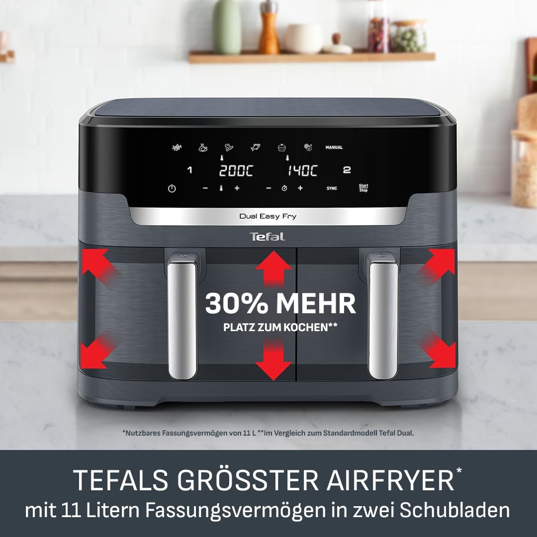Einzelheiten: Die Tefal Dual Easy Fry XXL (EY942BE0) ist eine familienfreundliche Doppelkammer-Heißluftfritteuse mit insgesamt 11 Litern Fassungsvermögen. Zwei unabhängig steuerbare Schubladen – eine XXL-Schublade mit 6,5 L für große Zutaten und eine 4,5-L-Schublade für Beilagen – ermöglichen es, komplette Mahlzeiten in einem Durchgang zuzubereiten. Dank synchronisiertem Garen werden beide Gerichte gleichzeitig fertig, ohne dass Sie Zeiten umständlich anpassen müssen. Mit 7 voreingestellten Programmen für Pommes Frites, Hähnchen, Gemüse, Fisch, Dessert, Dörren und einen manuellen Modus gelingen unterschiedlichste Speisen auf Knopfdruck – knusprig, gleichmäßig gegart und nahezu ohne zusätzliches Fett. Die Extra-Crisp-Heißlufttechnologie sorgt für goldbraune Ergebnisse mit bis zu 99 % weniger Fett im Vergleich zu einer herkömmlichen Fritteuse, sodass Sie und Ihre Familie bewusster genießen können. Die Dual Easy Fry XXL ist nicht nur vielseitig, sondern auch besonders effizient: Im Vergleich zu herkömmlichen Backöfen können Gerichte bis zu 45 % schneller gelingen und dabei bis zu 70 % weniger Energie verbrauchen (Tests mit tiefgefrorenen Pommes frites). Über das digitale Display stellen Sie Zeit und Temperatur präzise ein und behalten beide Schubladen komfortabel im Blick. Antihaftbeschichtete, spülmaschinengeeignete Körbe erleichtern die Reinigung nach dem Kochen erheblich, während das robuste Design ideal für den täglichen Einsatz in größeren Haushalten ist. Ob knusprige Pommes, saftiges Hähnchen, Ofengemüse, Fisch, Snacks oder schonend gedörrtes Obst – die Tefal Dual Easy Fry XXL bietet maximale Flexibilität bei minimalem Aufwand. Kurzvorteile: Doppelkammer-Heißluftfritteuse 11 L | 2 Schubladen 6,5 L & 4,5 L | Synchronisiertes Garen | 7 Programme inkl. Dörren & manuell | Bis zu 99 % weniger Fett | Bis zu 70 % Energieersparnis | Digitales Display | Antihaft & spülmaschinengeeignet