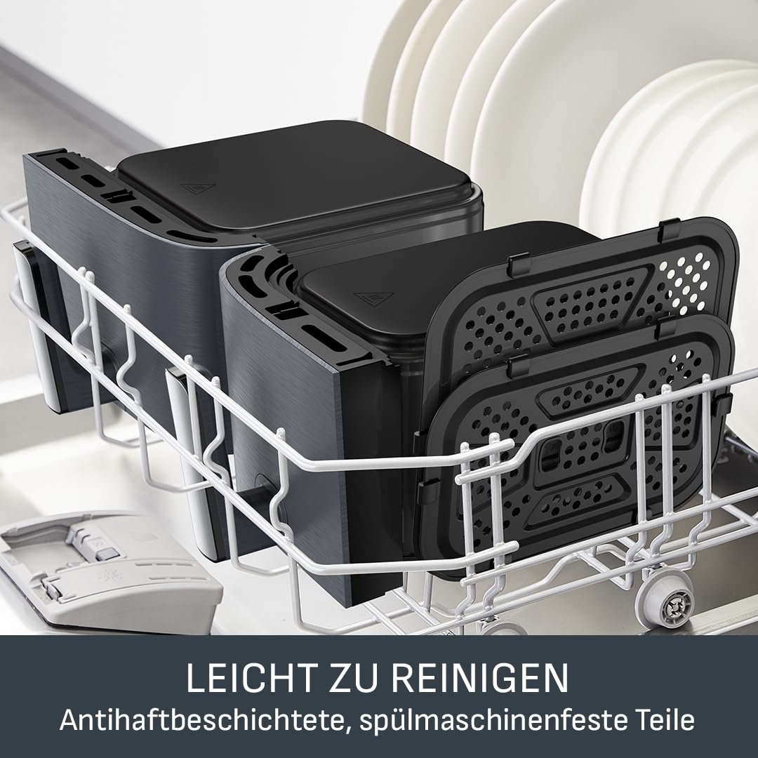 • Doppelkammer-Heißluftfritteuse: Zwei voneinander unabhängige Schubladen (XXL- und Standard-Größe) zum Garen von zwei verschiedenen Gerichten, die gleichzeitig fertig sind